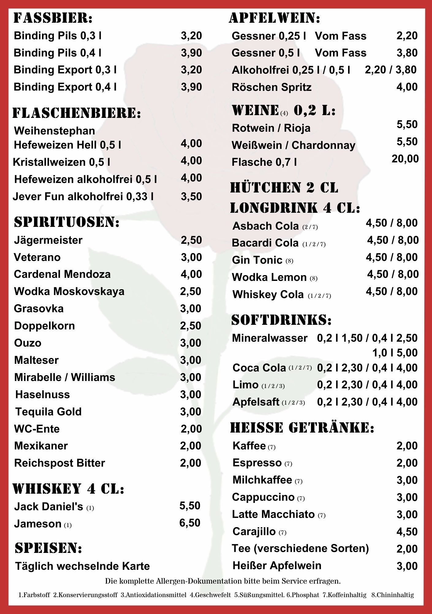 Für das leibliche Wohl ist bei uns natürlich bestens gesorgt! Essen bieten wir gemäß unserer wechselnden Tageskarte an – schaut einfach vorbei, es wird sicher jeder fündig.